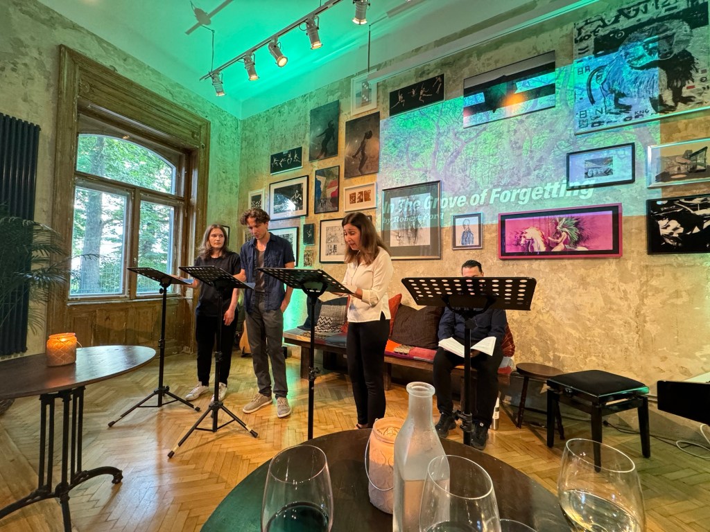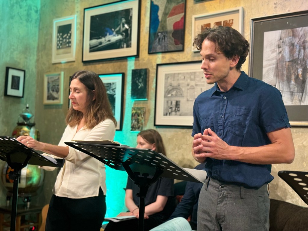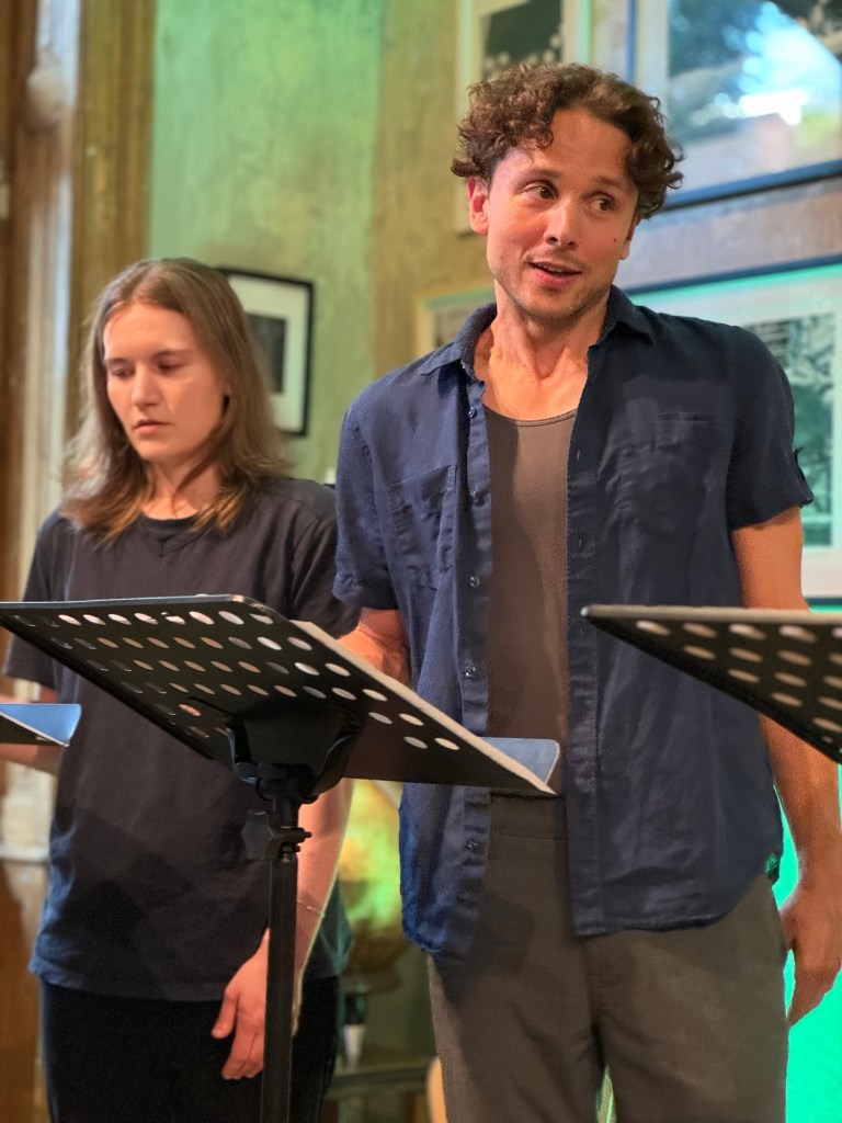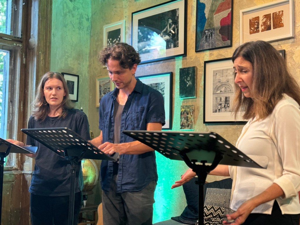 Balázs, Géza and Sasha started the first reading with Amy and Bob at 10:00 Saturday morning. A stumble through to say the least, but by the end of our workshop, Sunday evening at five, they were ready to deliver a rehearsed reading of note!