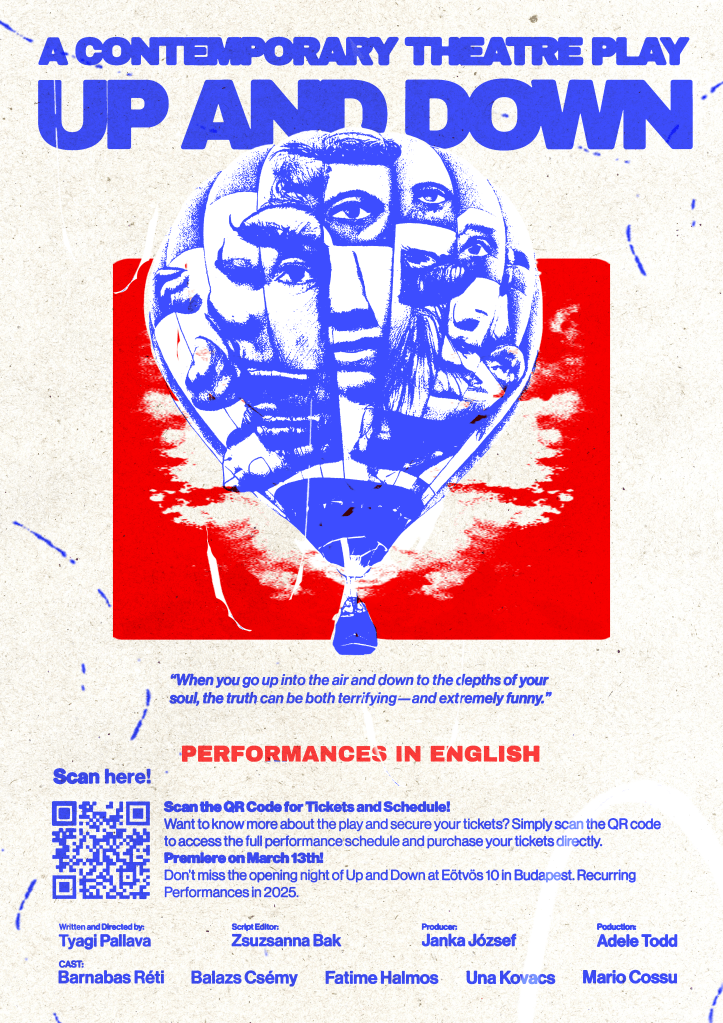Up & Down is a contemporary dark comedy theatre play in English (with Hungarian subtitles) that explores themes of identity, power, and belonging. Set in the surreal and confined space of a hot air balloon, the play blends humour with existential questions, challenging societal norms while offering a unique theatrical experience.