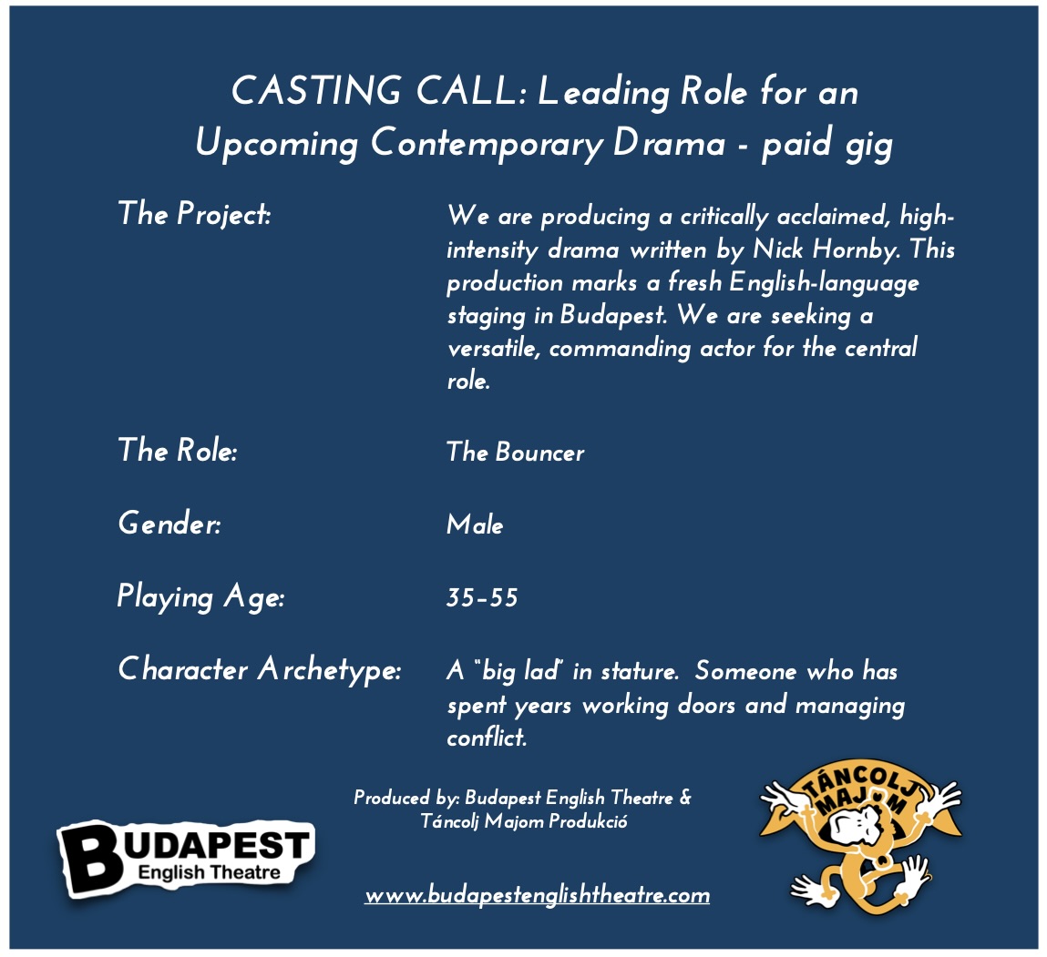 We are producing a critically acclaimed, high-intensity drama written by Nick Hornby. This production marks a fresh English-language staging in Budapest. We are seeking a versatile, commanding actor for the central role.